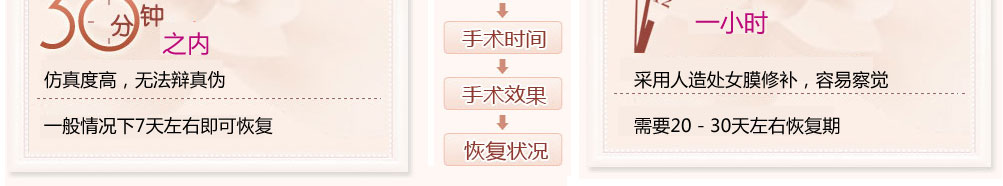 令女性难以相信的是,韩式处女膜修复术比普通处女膜修复术手术时间更短,一般30分钟以内即可完成,正常落红率可高达99%以上,从而更能增加女性自信。